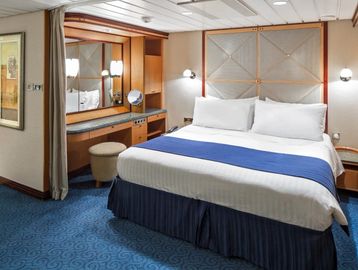 Located on the rear of the ship for great views. Room includes bed, vanity and seating area with sofa. HD-TV, Bathroom with tub, hairdryer, shampoo, conditioner and body wash. Closet with safe for valuables. Private balcony with chairs.