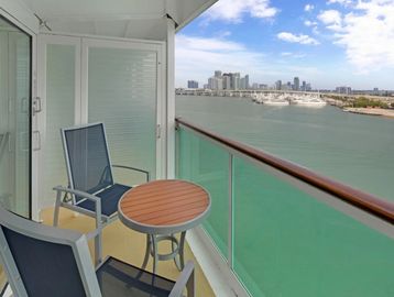 Larger Balcony with chairs to enjoy the seabreeze and fresh air. Room includes bed, vanity and seating area. HD-TV, Closet with safe for valuables. Bathroom with shampoo, conditioner, and Body wash.